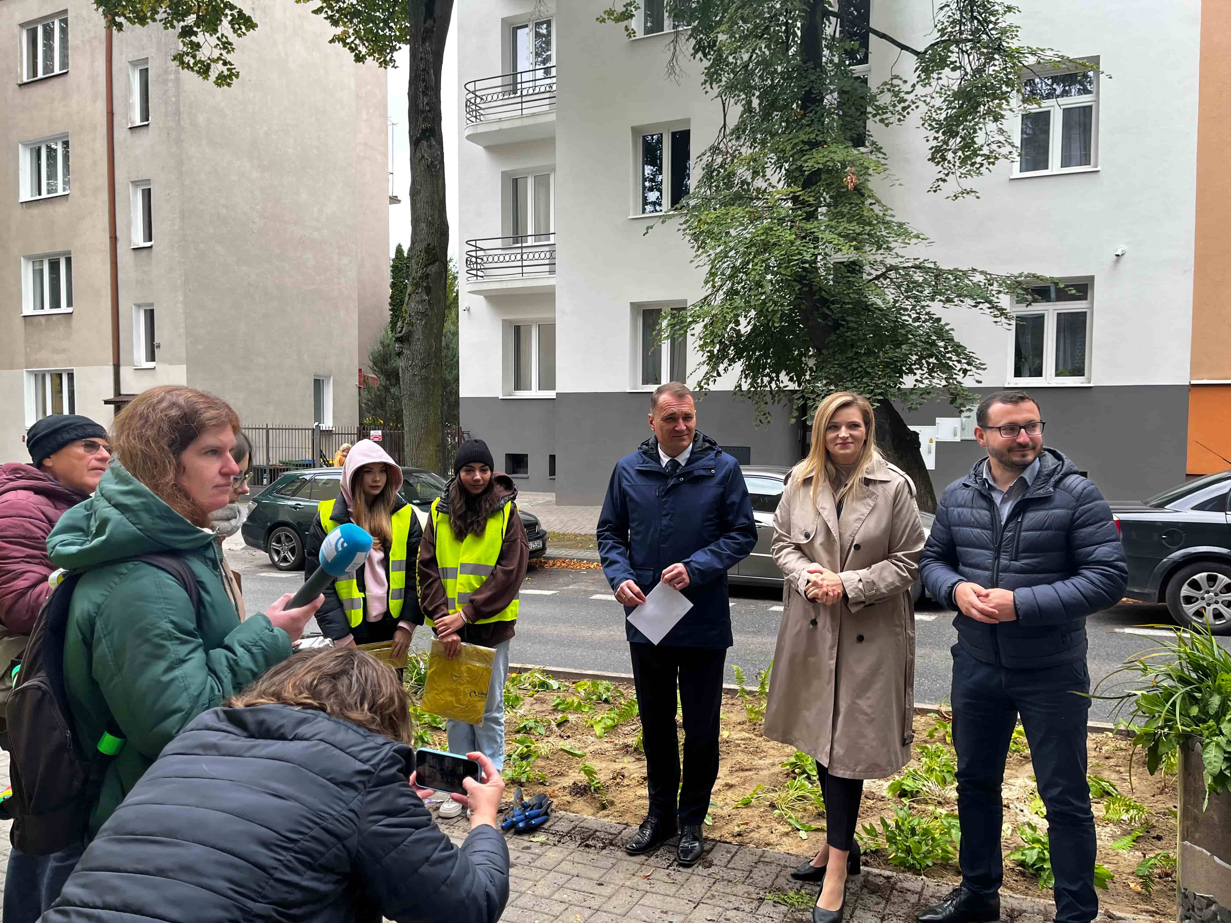 W ramach otwarcia inwestycji przy ul. Obrońców Pokoju przedstawiciele Programu: Dagny Czajkowska oraz Ariel Wojciechowski spotkali się z władzami miasta: Beatą Stepaniuk-Kuśmierzak - Zastępczynią Prezydenta Miasta, Arturem Szymczykiem - Zastępcą Prezydenta Miasta, Blanką Rdest-Dudak - Dyrektor Wydziału Zieleni i Gospodarki Komunalnej Urzędu Miasta i jego pracownikami, przedstawicielami Arbre Architektura Krajobrazu - wykonawcą inwestycji, przedstawicielami lokalnych mediów oraz kadrą i uczniami V Liceum Ogólnokształcącego, by porozmawiać o roli ogrodów deszczowych w przestrzeni miejskiej.